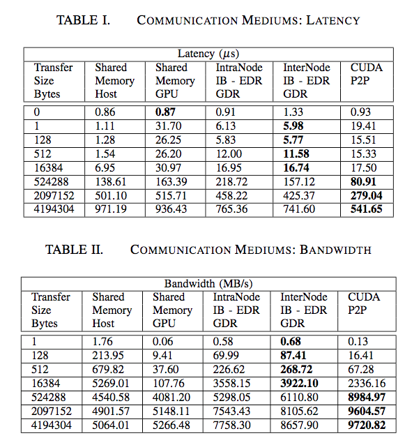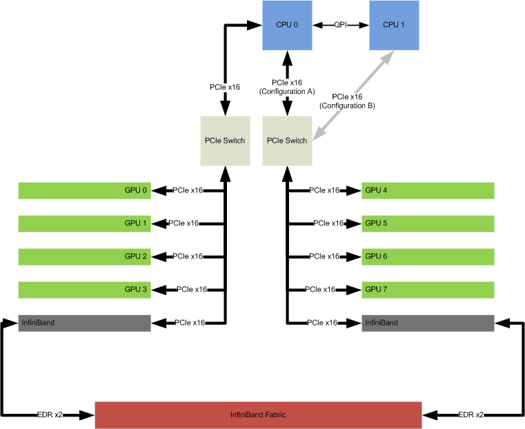 (These particular results are with NVIDIA K80 GPUs and single-port Mellanox Connect-X4 EDR InfiniBand cards connected to a Mellanox EDR switch, using Configuration B from the diagram above)